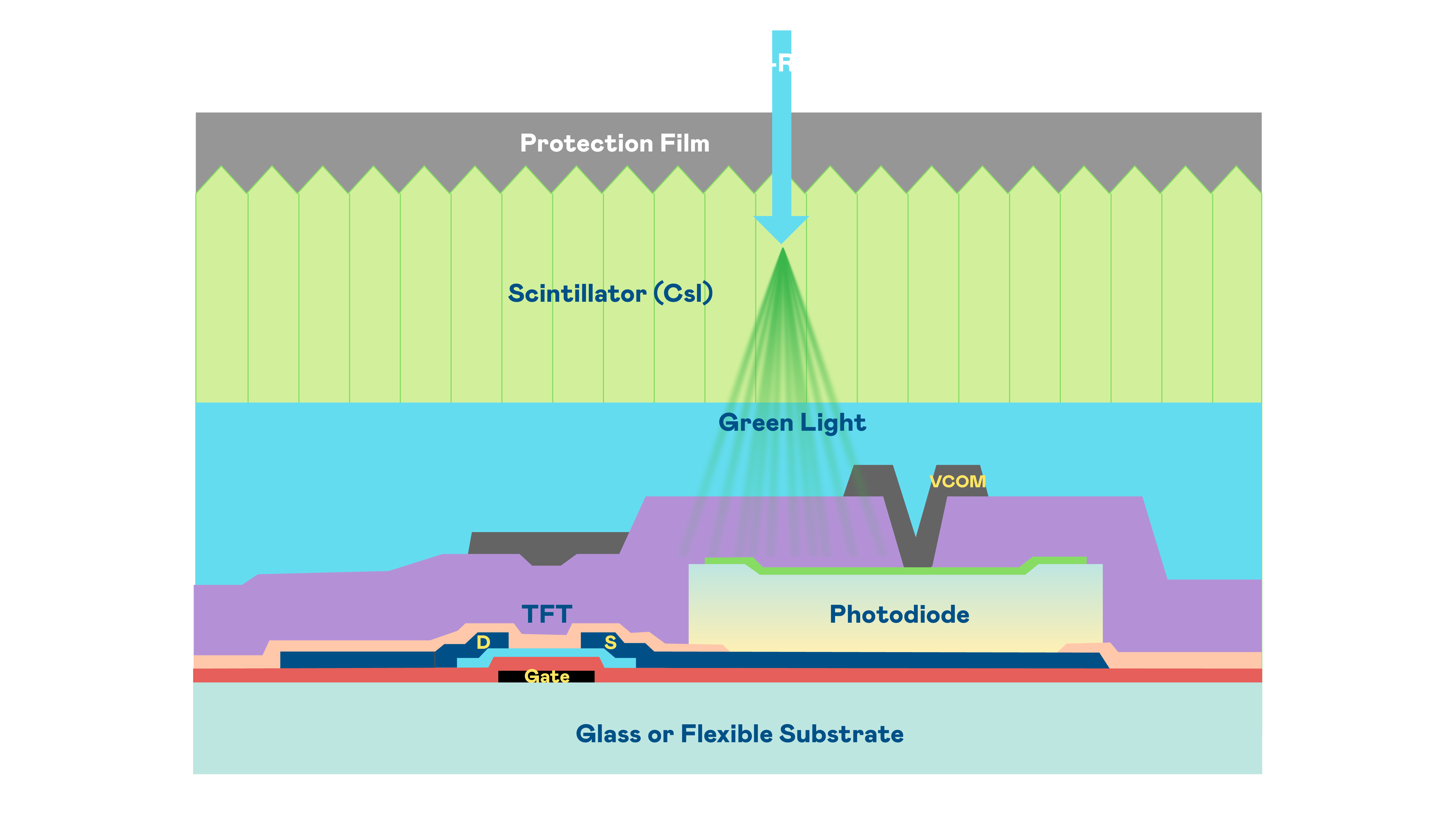 yd12399云顶的X光影像感测阵列使用薄膜电晶体 (TFT) 作为每个像素的读取开关,搭配光电二极体(Photodiode)的光电转换元件,用以感测X光影像讯号。